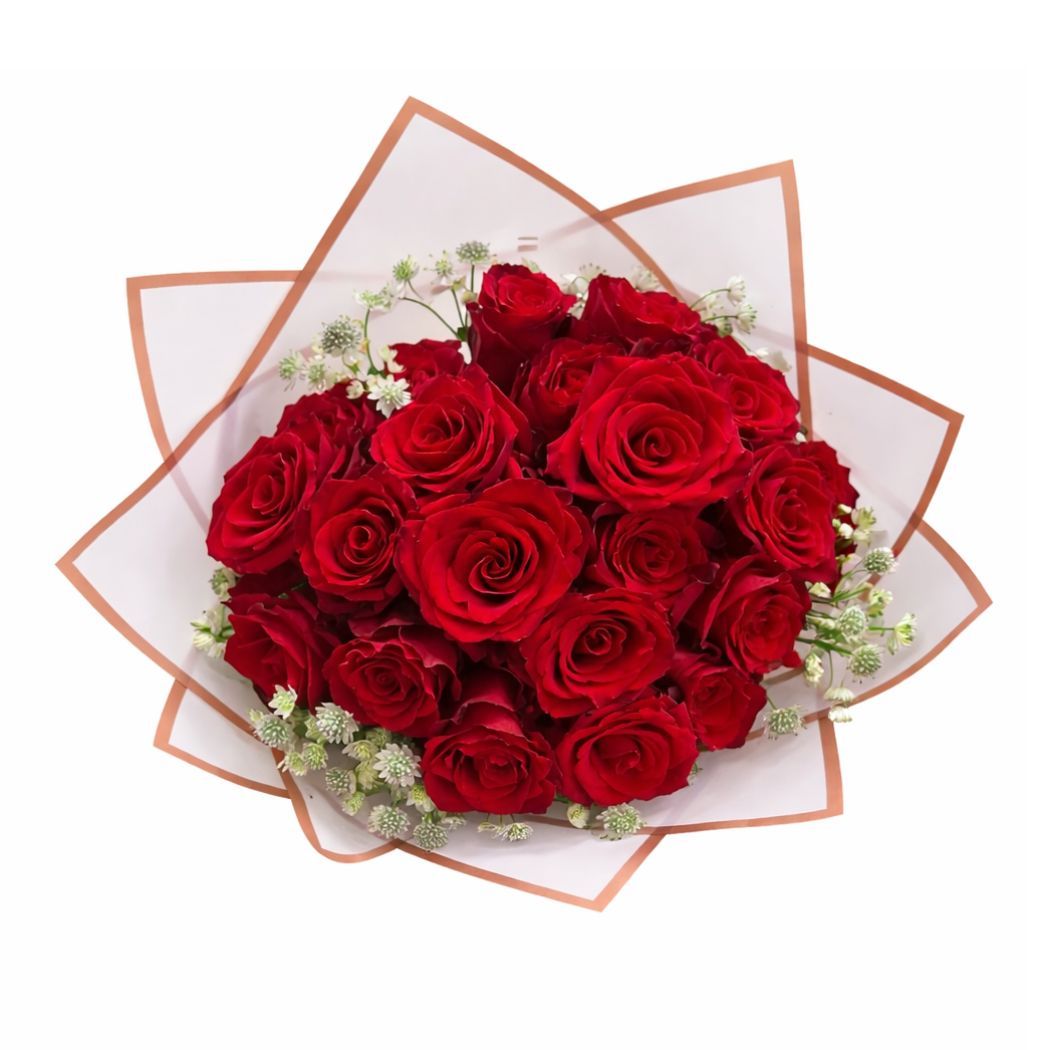 Το κόκκινο συμβολίζει το πάθος! Ένα κλασσικό μπουκέτο που αποτελεί δυνατή δήλωση αγάπης και αποπνέει διαχρονική κομψότητα. Είκοσι (20) επιλεγμένα βελούδινα κόκκινα τριαντάφυλλα κορυφαίας ποιότητας συνδυάζονται με λευκά διακοσμητικά στοιχεία σε μια σύνθεση που αποπνέει έντονο πάθος.