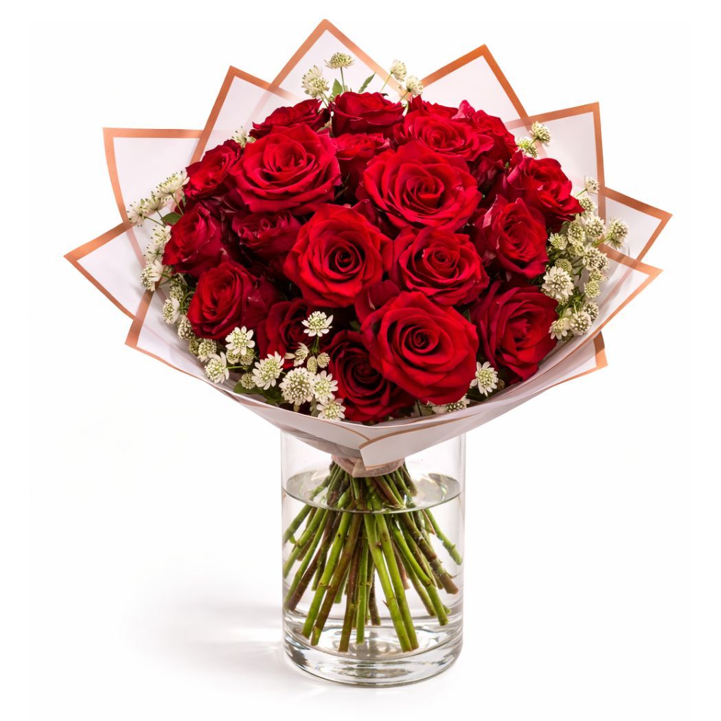 • Σύνθεση: Κόκκινα Τριαντάφυλλα διακοσμημένα με λευκή αστράντια που προσθέτει φως.