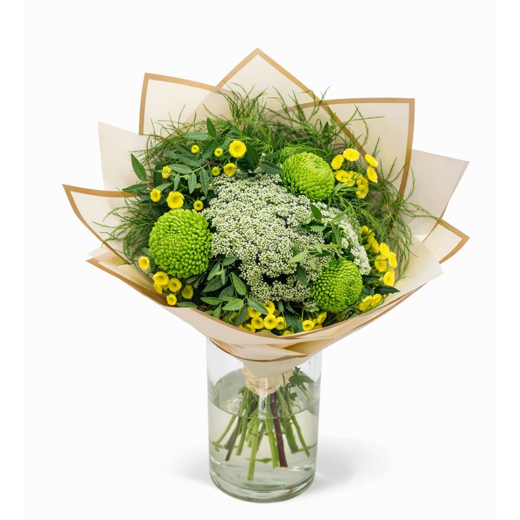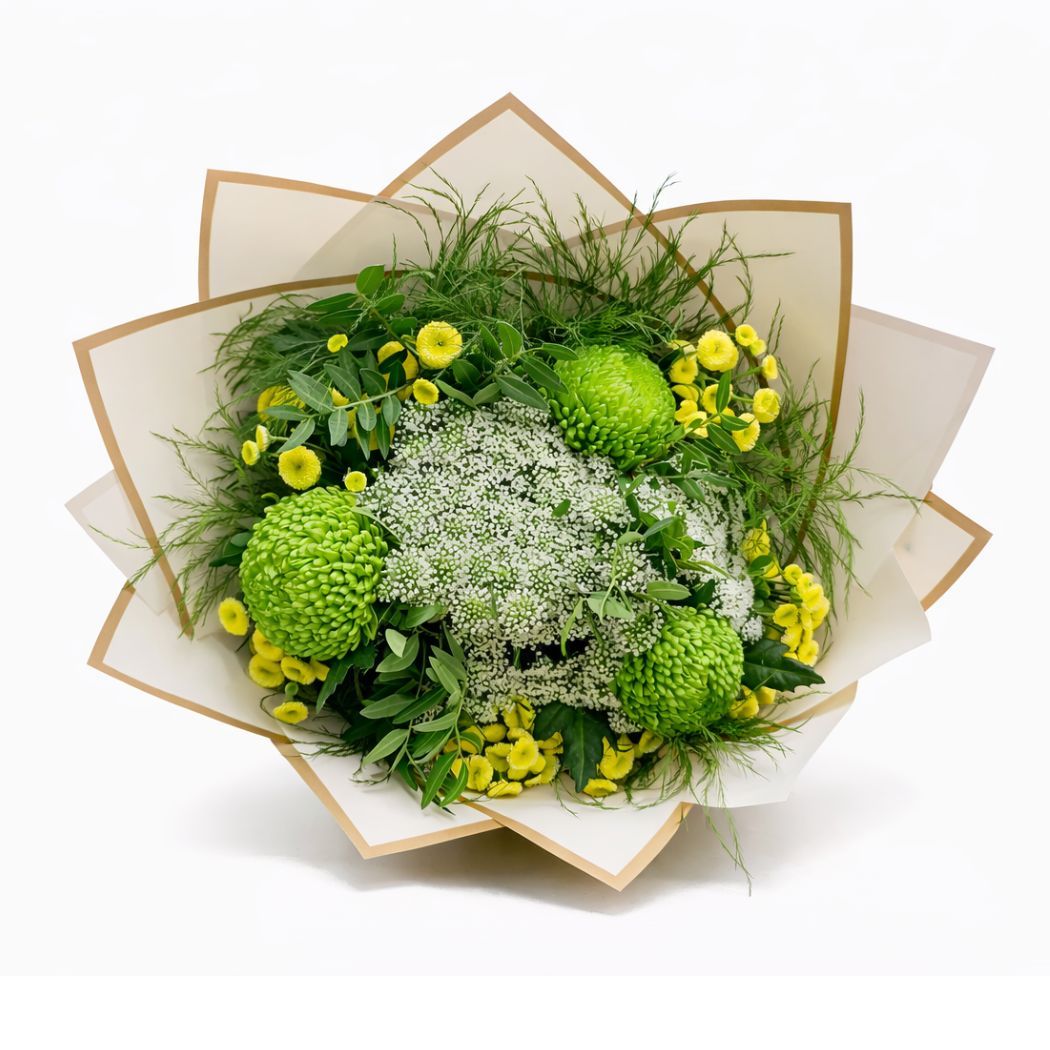 Ανοιξιάτικο μπουκέτο σε πράσινες αποχρώσεις που προκαλεί αίσθηση ηρεμίας, φρεσκάδας και ισορροπίας. Οι πράσινοι και λευκοί/κίτρινοι τόνοι, δίνουν μια κομψή και φυσική άποψη στο μπουκέτο. Επιλεγμένα χρυσάνθεμα κορυφαίας ποιότητας, συνδυάζονται με πράσινο φύλλωμα και διακοσμητικές λεπτομέρειες (Ματρικάρια) δίνοντας ένα ευχάριστο και φρέσκο αποτέλεσμα.