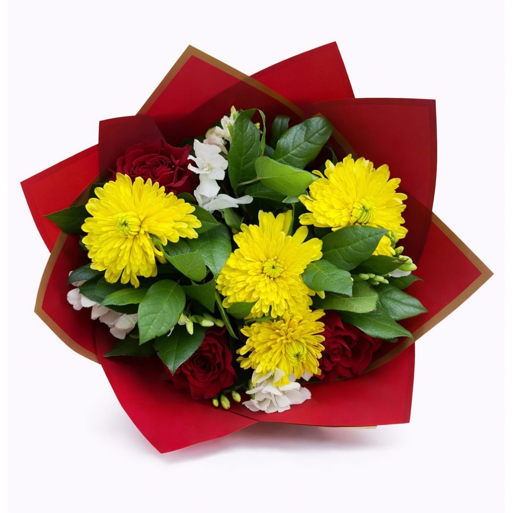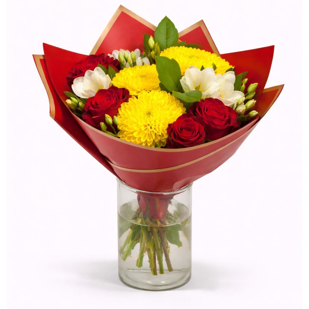 Σύνθεση: Κόκκινα τριαντάφυλλα, Κίτρινα κεφαλάτα χρυσάνθεμα και Φρέζιες.