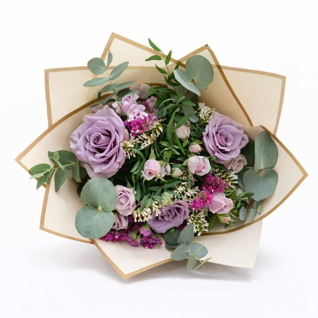 Μπουκέτο με τριαντάφυλλα, μίνι τριαντάφυλλα και αμάραντο "Lilac Elegance Bouquet"