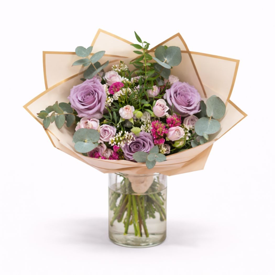 Η γοητεία του ρομαντισμού. Ένα καλαίσθητο μπουκέτο με λιλά και ροζ αποχρώσεις, που αποτελεί δήλωση τρυφερόπτητας και ηρεμίας. Επιλεγμένα τριαντάφυλλα σε συνδυασμό με πλούσιο φύλλωμα, συνθέτουν ένα απαλά ρομαντικό και εκλεπτυσμένο αποτέλεσμα.