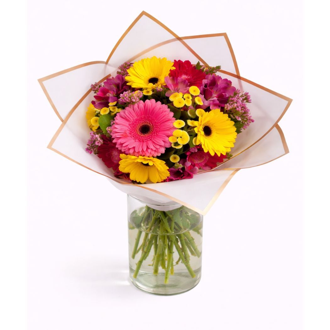 Μπουκέτο με Ζέρμπερες, Αλστρομέριες και Αμάραντο "Vivid Petals Bouquet"