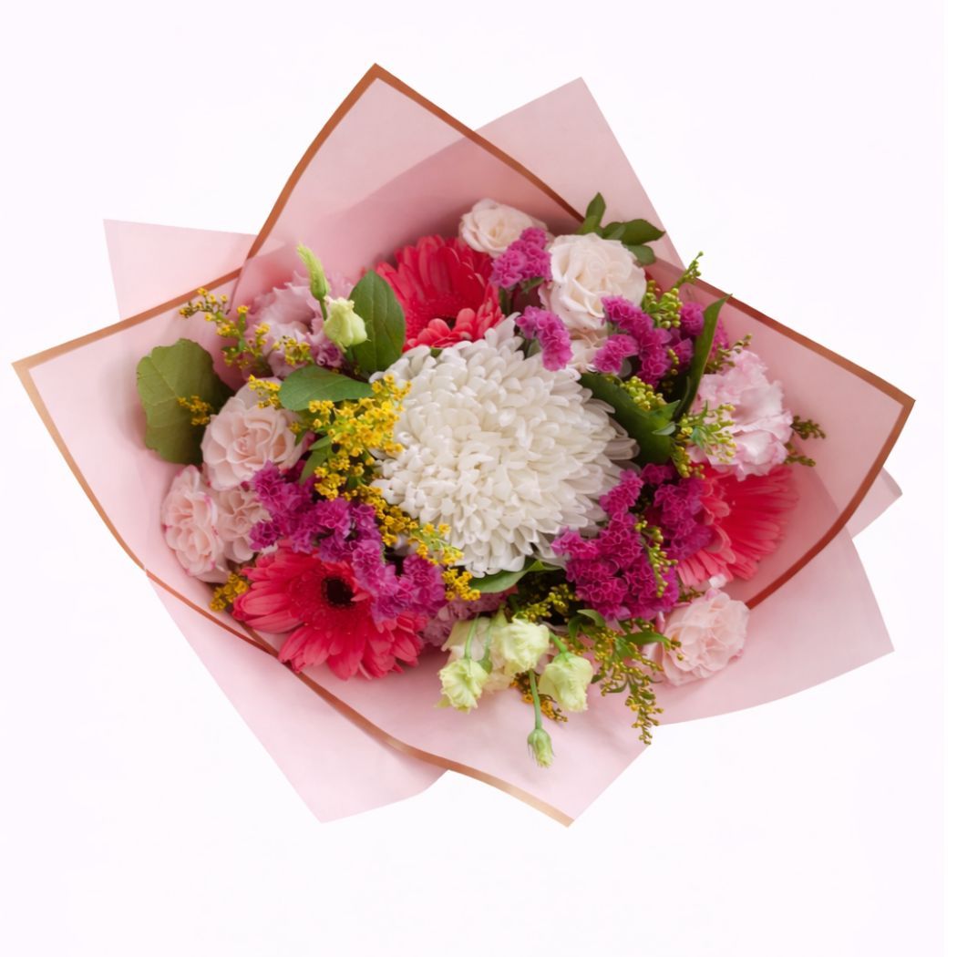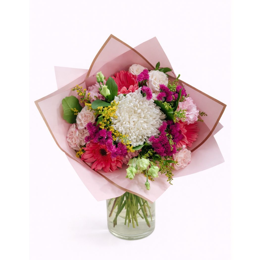 Μπουκέτο Με Ζέρμπερες, Λυσίανθο, Κεφαλάτο Χρυσάνθεμο, Μίνι Τριαντάφυλλα Και Αμάραντο"Pink Blossom Bouquet"