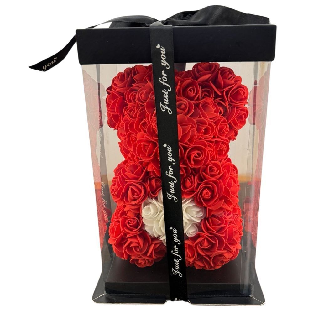 Κόκκινο αρκουδάκι με λευκή καρδιά από τεχνητά τριαντάφυλλα ύψους 25 cm.Ιδανικό δώρο για τον/την αγαπημένο/νη σας. Σε πολυτελές gift box σίγουρα θα εντυπωσιάσει αλλά και θα κρατήσει για πάντα υπενθιμίζοντας στο άλλο σας μισό, τα συναισθήματα σας!