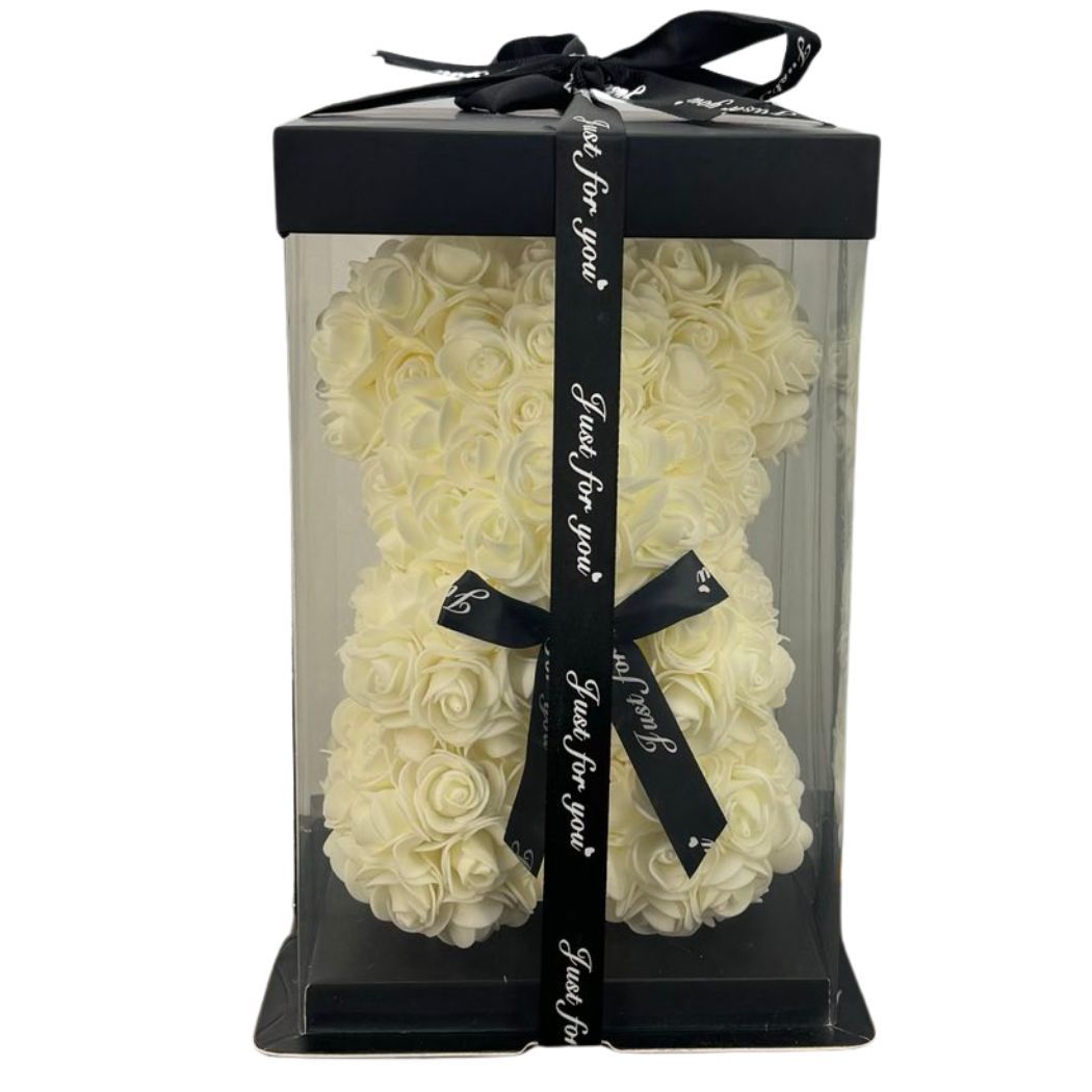 Ιβουάρ αρκουδάκι από τεχνητά τριαντάφυλλα ύψους 25 cm.Ιδανικό δώρο για τον/την αγαπημένο/νη σας. Σε πολυτελές gift box σίγουρα θα εντυπωσιάσει αλλά και θα κρατήσει για πάντα υπενθιμίζοντας στο άλλο σας μισό τα συναισθήματα σας!