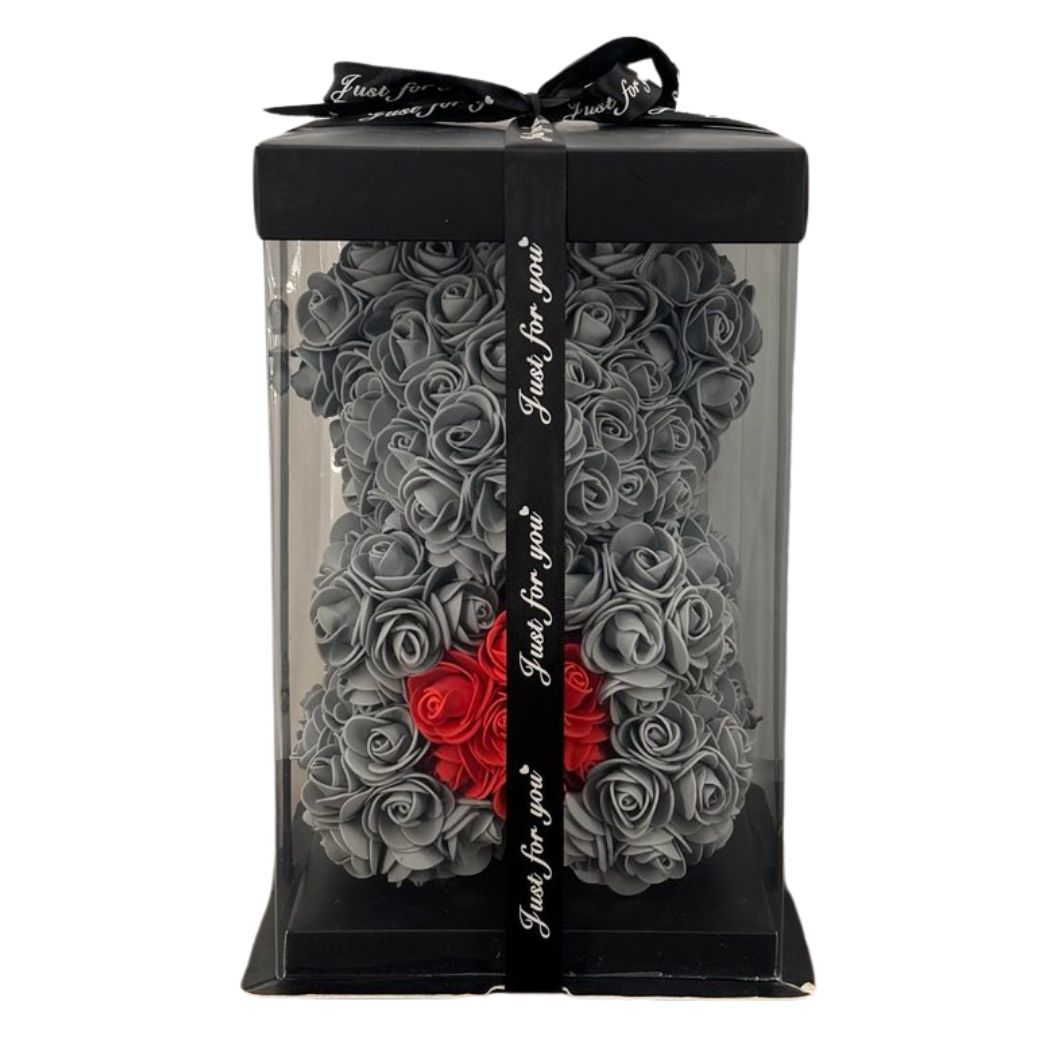 Γκρί αρκουδάκι με κόκκινη καρδιά από τεχνητά τριαντάφυλλα ύψους 25 cm.Ιδανικό δώρο για τον/την αγαπημένο/νη σας. Σε πολυτελές gift box σίγουρα θα εντυπωσιάσει αλλά και θα κρατήσει για πάντα υπενθιμίζοντας στο άλλο σας μισό τα συναισθήματα σας!